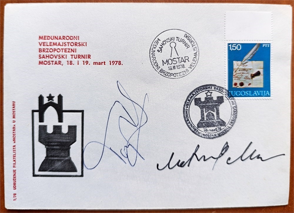 Cover with a special postmark from the International Blitz Tournament held in Mostar on March 18-19, 1978, signed by two of the participants - GM Tony Miles and GM Milan Matulovic. Size 17,5 x 12,5 cm.