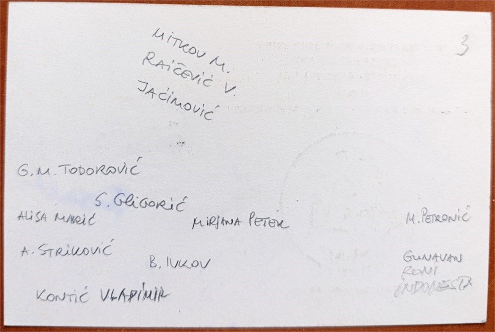 Special chess card with a postmark from the 40th jubilee Yugoslav Team Chess Championship held in Brezovica on August 21 - 31, 1988. Signed by 12 participants: GM Svetozar Gligoric, GM Borislav Ivkov, GM Goran Todorovic, GM Aleksa Strikovic, GM Vladimir Raicevic, WGM and IM Alisa Maric, WGM Mirjana Petek Medic, IM Ronny Gunawan (Indonesia), IM Marjan Mitkov, WIM Marija Petrovic, Dragoljub Jacimovic, Vladimir Kontic. Size 15,5 x 10,2 cm.