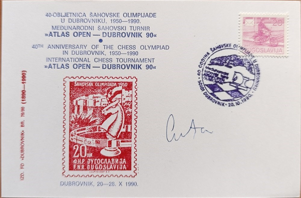 Special chess card with a postmark from the international Atlas Open chess tournament held in Dubrovnik from October 20 to 28, 1990, on the occasion of the 40th anniversary of the Chess Olympiad. Signed by the tournament winner, Croatian Grandmaster Ognjen Cvitan.