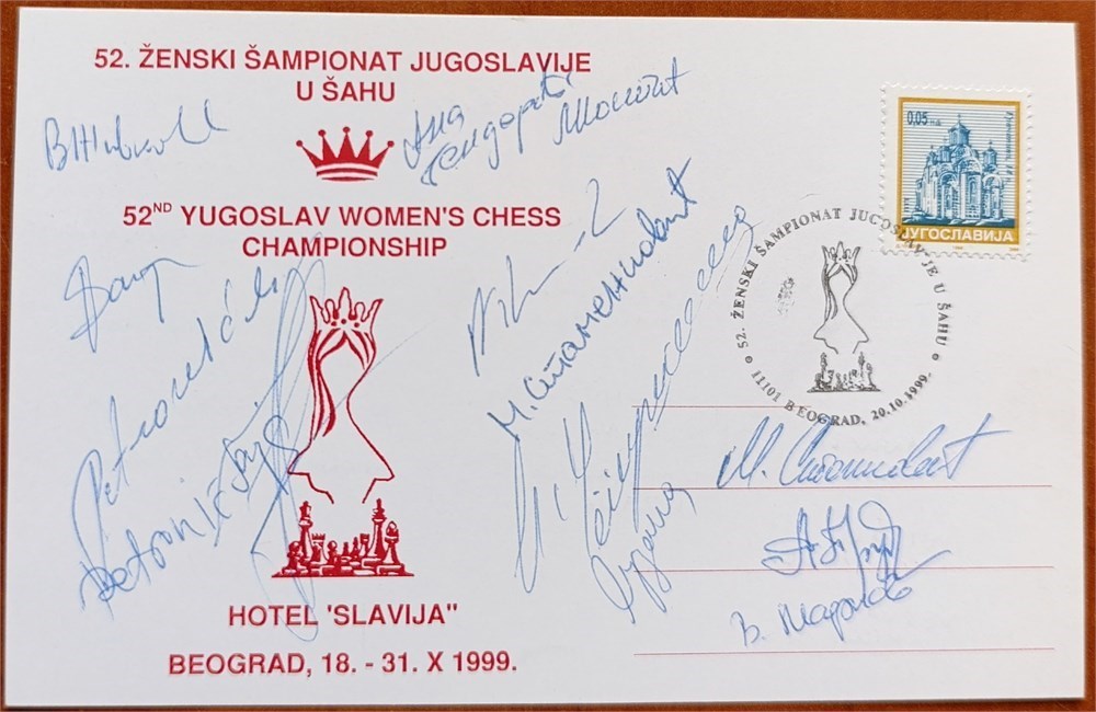 Special chess card with a postmark from the 52nd Yugoslav Women’s Chess Championship held in Belgrade on October 18 - 31, 1999. Signed by all 14 participants: WGM Irina Chelushkina, WGM Maria Manakova, WGM Suzana Maksimovic, WGM Mirjana Maric, WGM Ana Benderac, WGM Svetlana Prudnikova, WIM Marija Stankovic, WIM Maja Kostic, WIM Marija Petrovic, WIM Zorica Nikolin, WGM Sanja Kalevic, WIM Sanja Petronic, WIM Vesna Zivkovic, WFM Vesna Markov. Size 15,7 x 10 cm.