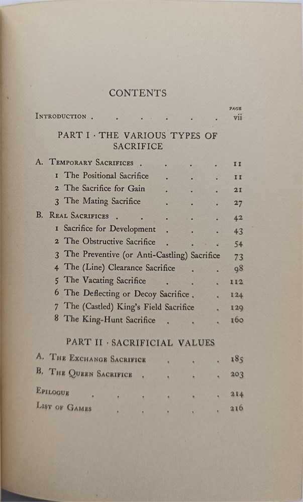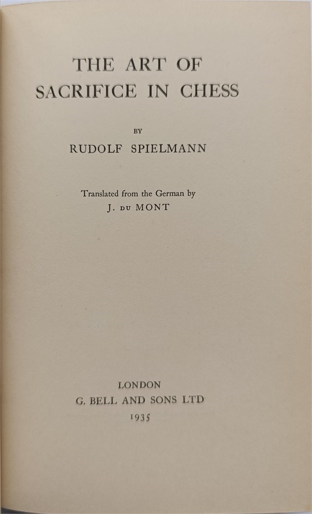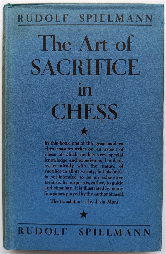 Spielmann, Rudolf. The Art of Sacrifice in Chess. Translated from the German by J. du Mont. London, Bell, 1935. In English. IX, 215 pages. Original cloth binding with gilt lettering on the spine, with dust jacket. LN 1628. Betts 19 - 6.