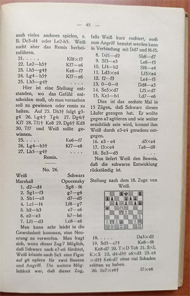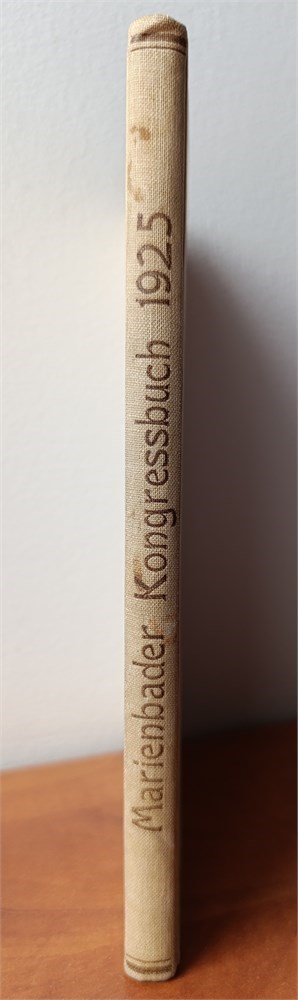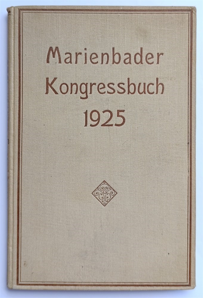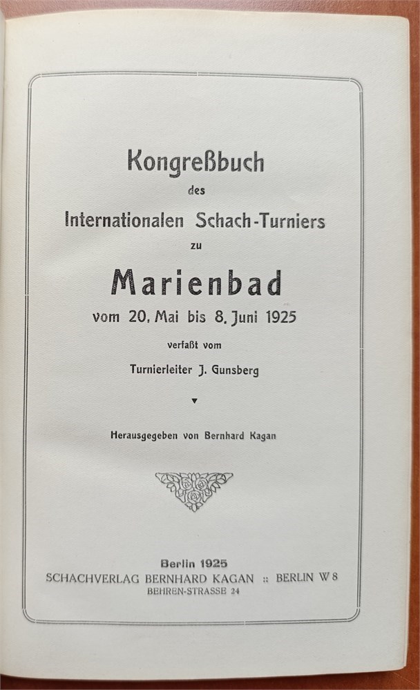 Gunsberg, Isidor. Kongreßbuch des Internationalen Schach - Turniers zu Marienbad vom 20. Mai bis 8. Juni 1925. Herausgegeben von Bernhard Kagan. Berlin, Kagan, 1925. In German. 4 plates with photos, 141 + 1 advertisement page. Original publisher's decorative cloth binding with printed title on front cover and spine. LN 5383.