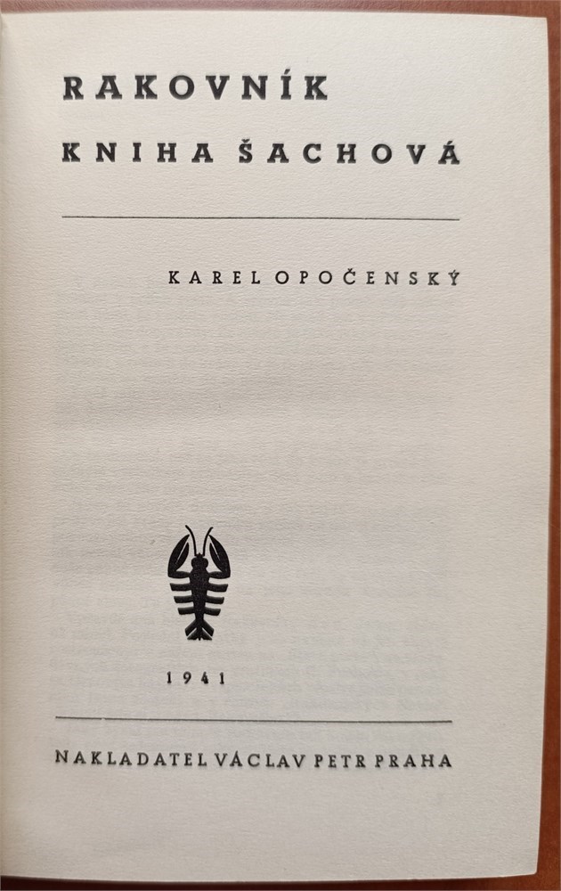 Opocensky, Karel. Rakovnik - kniha sachova. Praha, Vaclav Petr, 1941. In Czech. 272 pages,8 plates with photos. Original cloth binding with dust jacket. LN 5618. Soukup 75. Mokry 135.