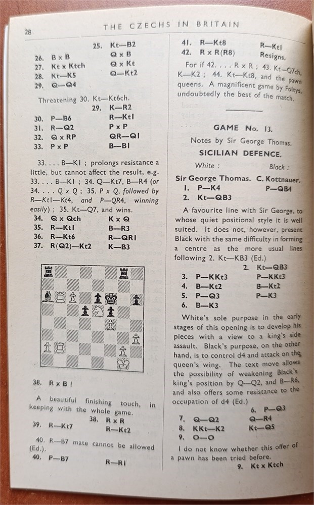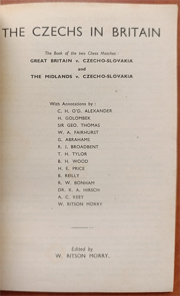 Morry, W. Ritson. The Czechs in Britain. The Book of the two Chess Matches: Great Britain v. Czecho-Slovakia and The Midlands v. Czecho-Slovakia. In English. 77 + 3 advertisement pages. Descriptive notation. LN 5153. Betts 26 - 10. Original softcover.