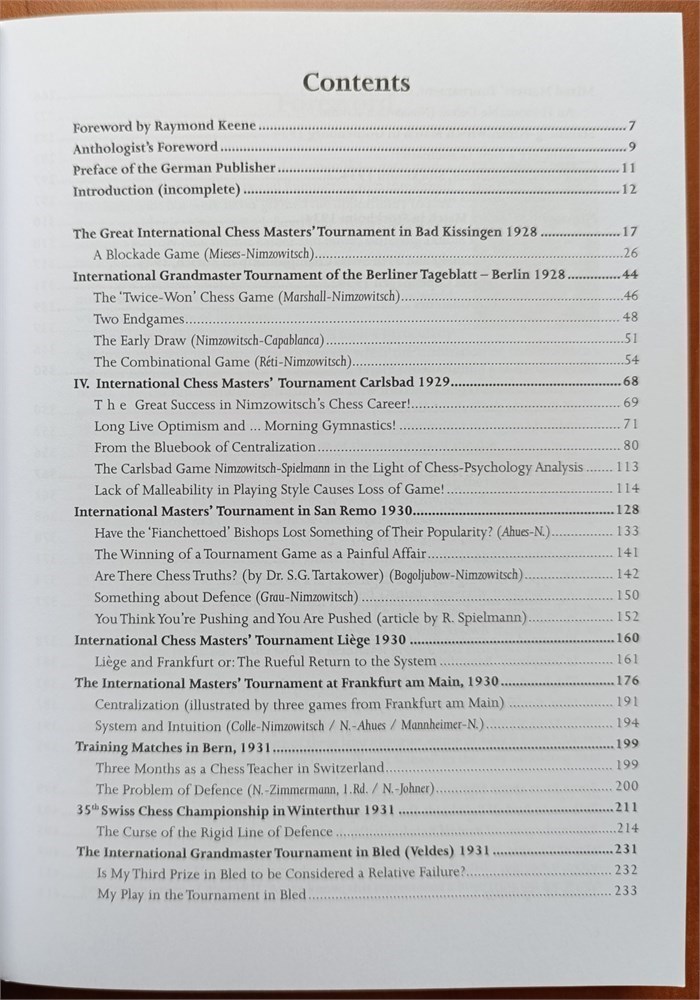 During several decades of research, German chess historian Rudolf Reinhardt (1937-2006) compiled, from an immense variety of sources, all the games Nimzowitsch played after 1928. They are presented with notes by Nimzowitsch himself and, in some cases, by his contemporaries. In addition to the games, Reinhardt also collected the articles and essays that Nimzowitsch wrote during that period.