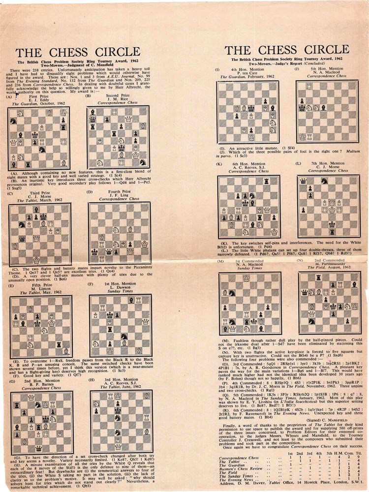 The Chess Circle - Reprinted from The Tablet, August 24th, 31st and September 7th, 1963, printed on both sides, size 21x29 cm.