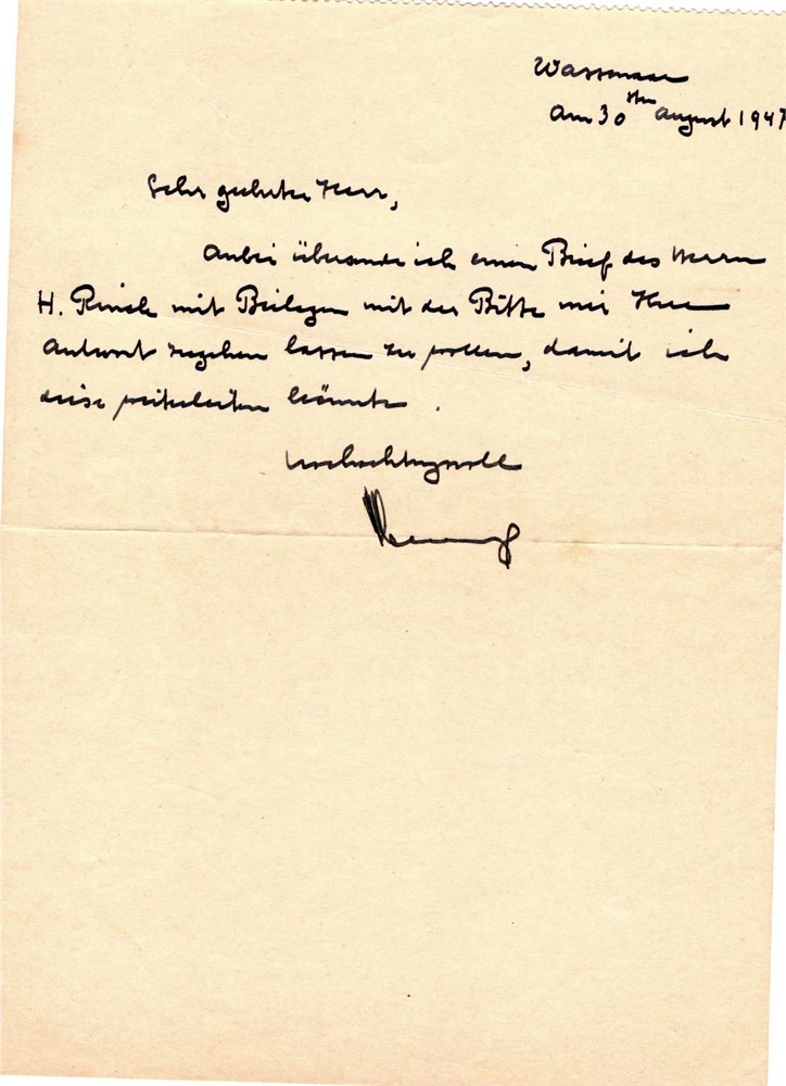 NIEMEIJER Meindert - 1947.08.30, Wassenaar. Letter (to P. Farago), size 14x19 cm, hand-written, in German.