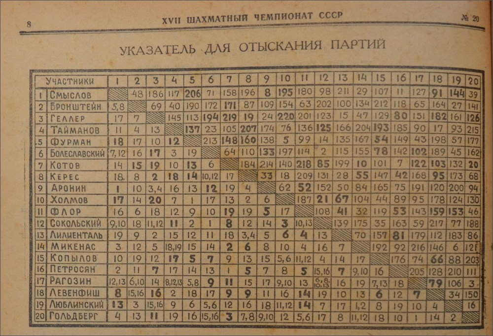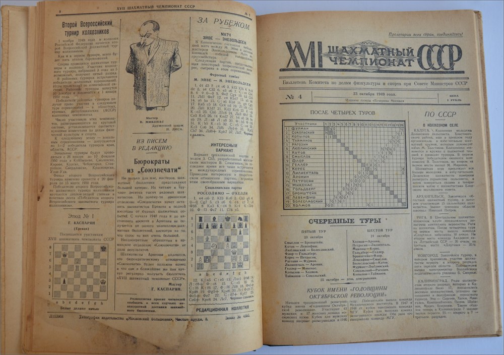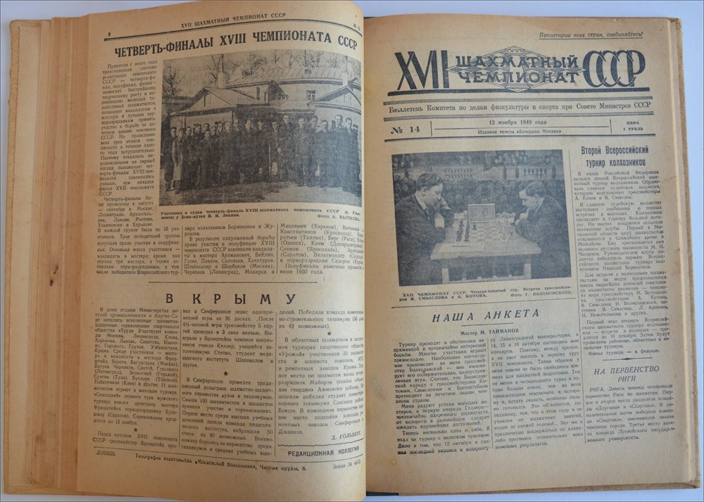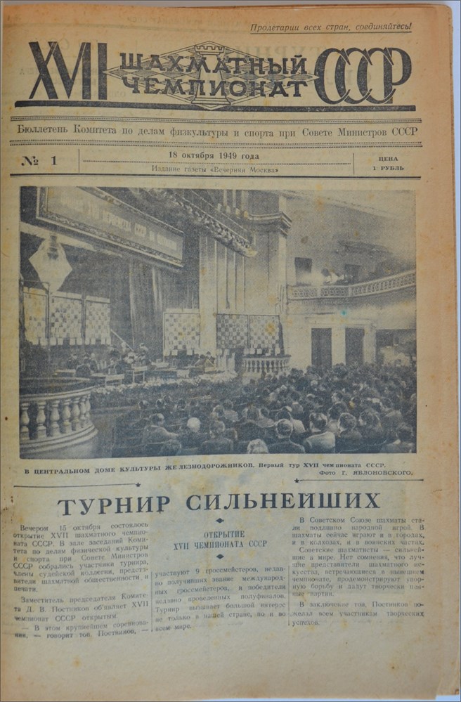 This volume contains all of the bulletins from the 17th Soviet Union Chess Championships held in Moscow in 1949. LN 5774, DeFelice 1401.1, Sakharov (1968 edition) 1011