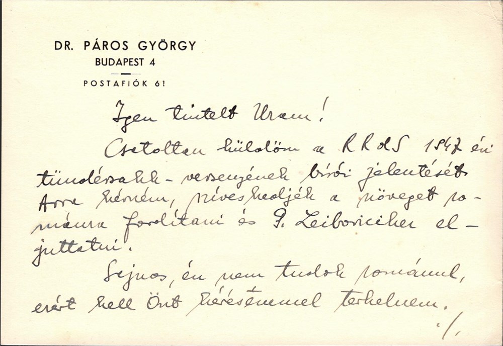 Postcard to P. Farago, with en-tete "Dr. Paros Gyorgy …", hand-written, in Hungarian.
