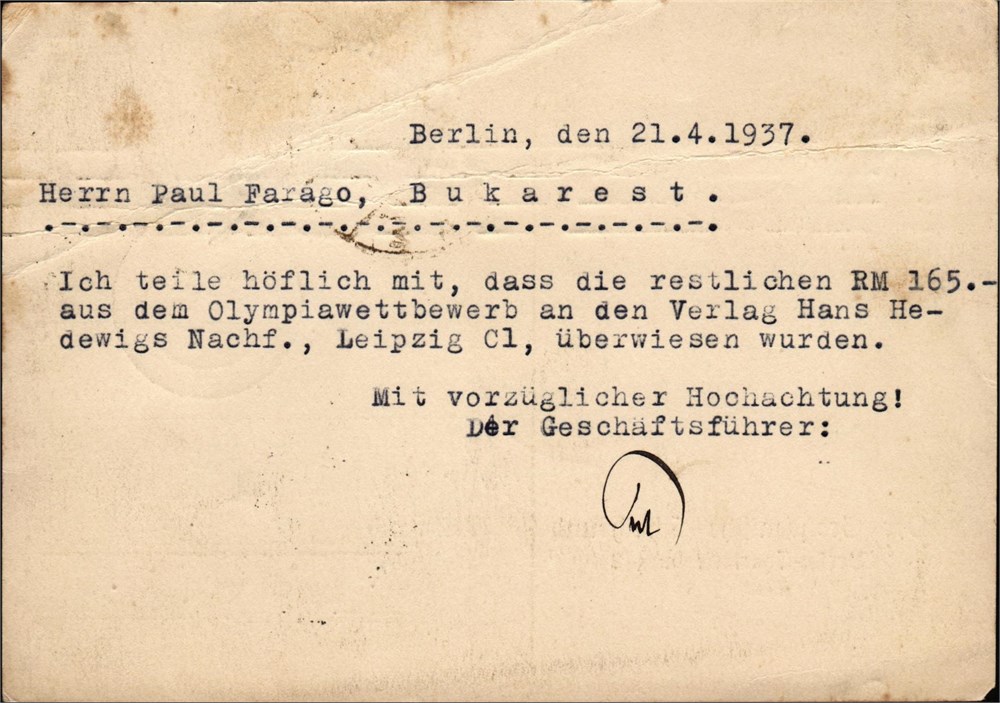 Postcard to P. Farago, pre-printed for "Grossdeutsche Schachbund", type-written, in German. Original signed, probably by Ehrhardt Post, who was in charge in that time.