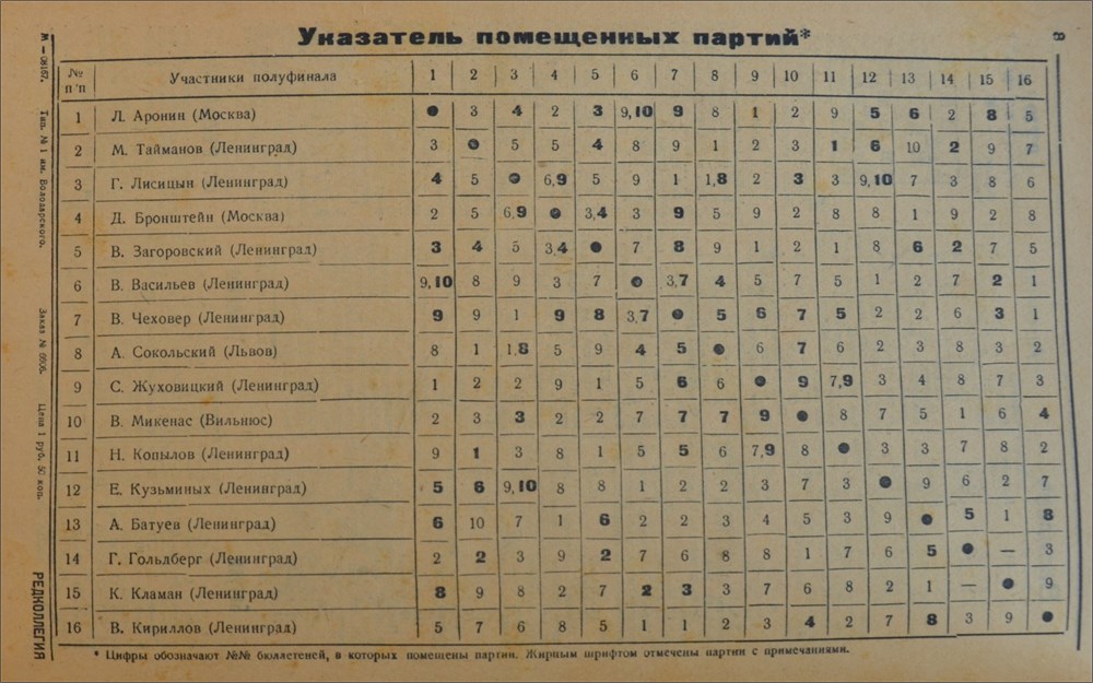 The tournament was won by Aronin ahead of Taimanov, Lisitsyn, Bronstein, Zagorovsky, Vasiliev etc.