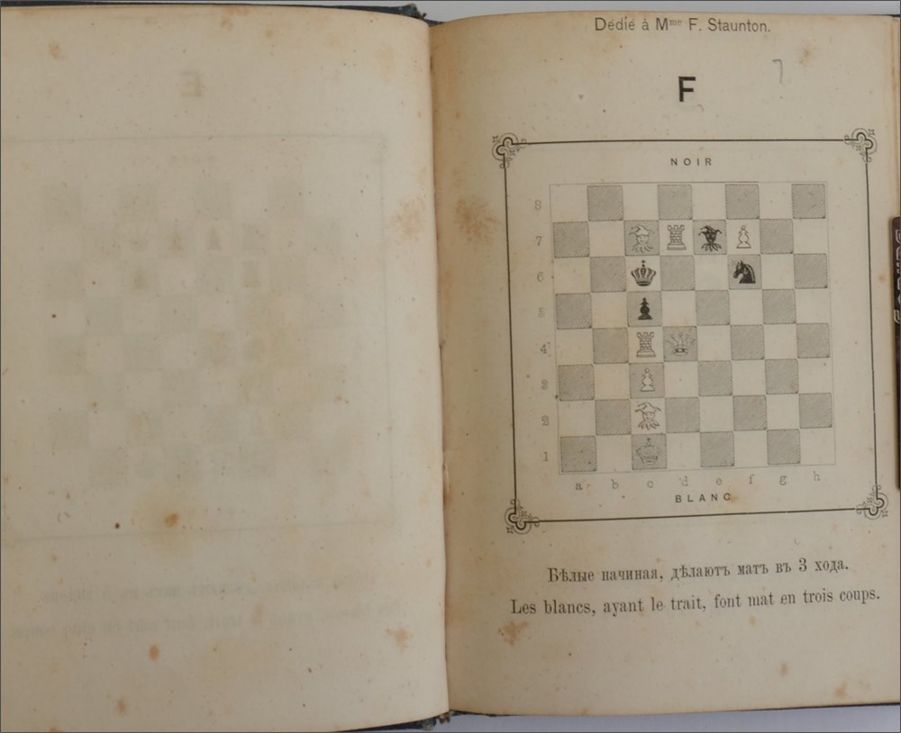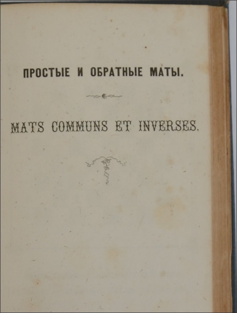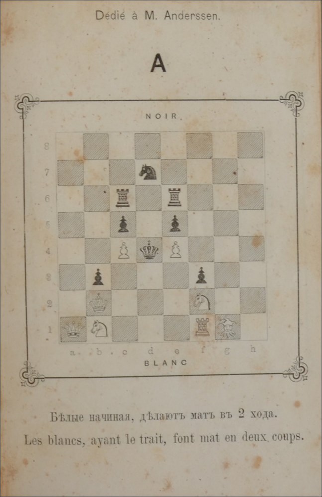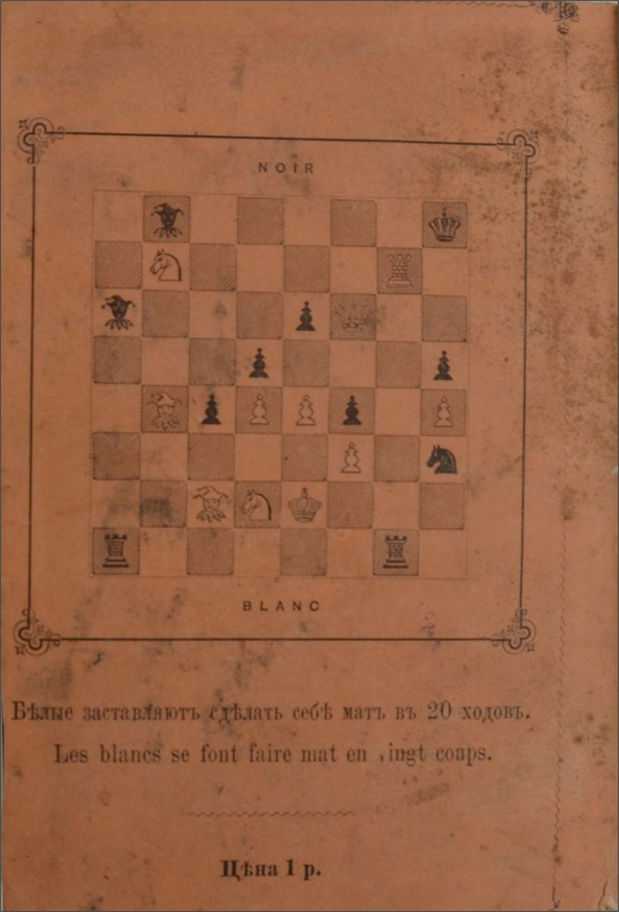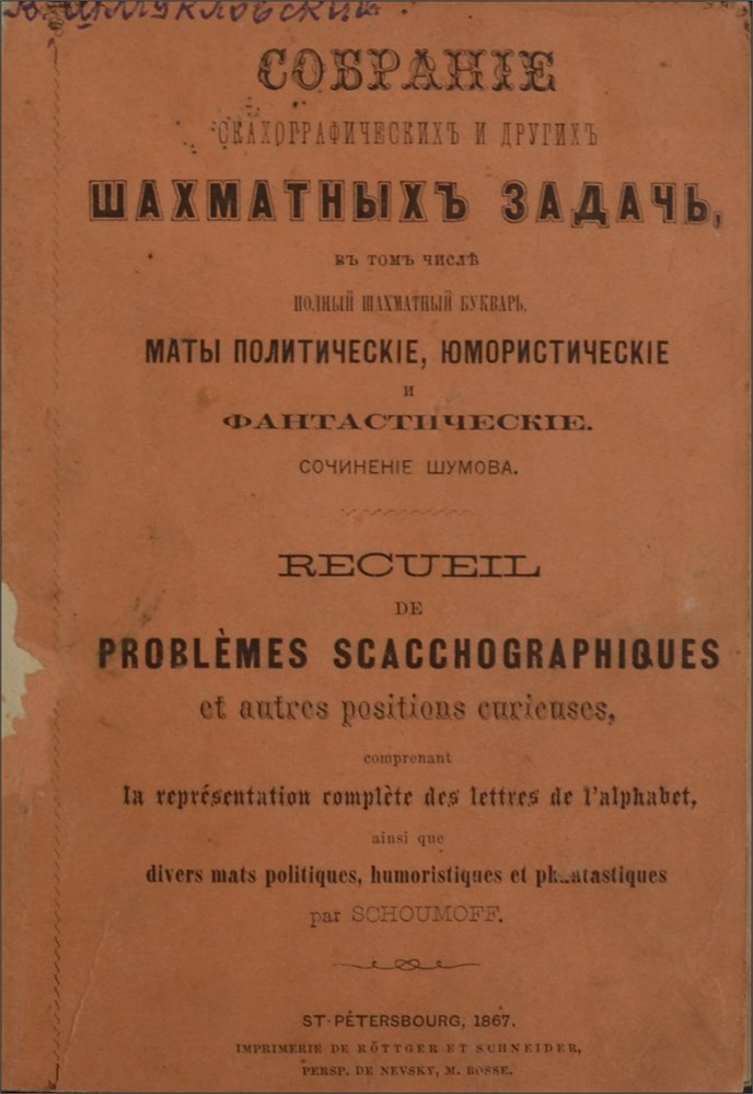 Recueil de Problemes Scacchographiques et autres positions curieuses (and the Russian equivalent) published in St Petersburg in 1867. LN 2408.