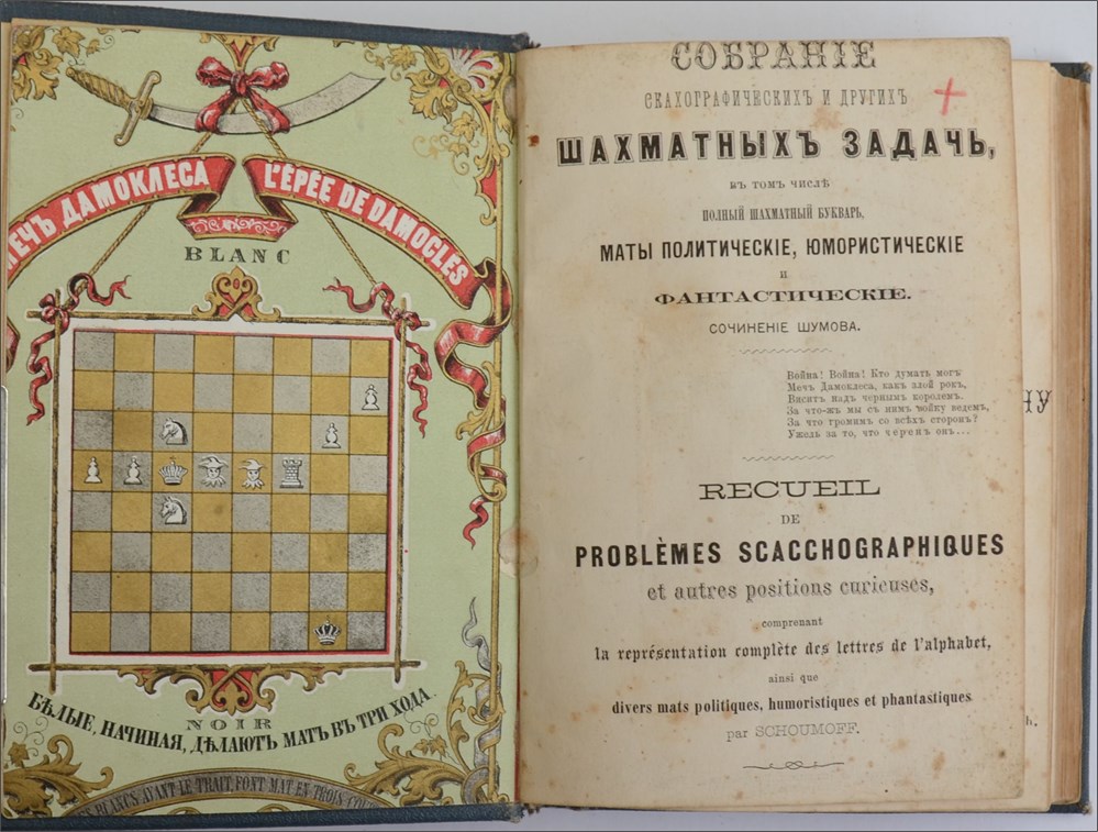 Schoumoff's first Russian collection of chess problems contains around 80 problems of various types printed on the rectos only, with solutions. The text is in Russian and French throughout.