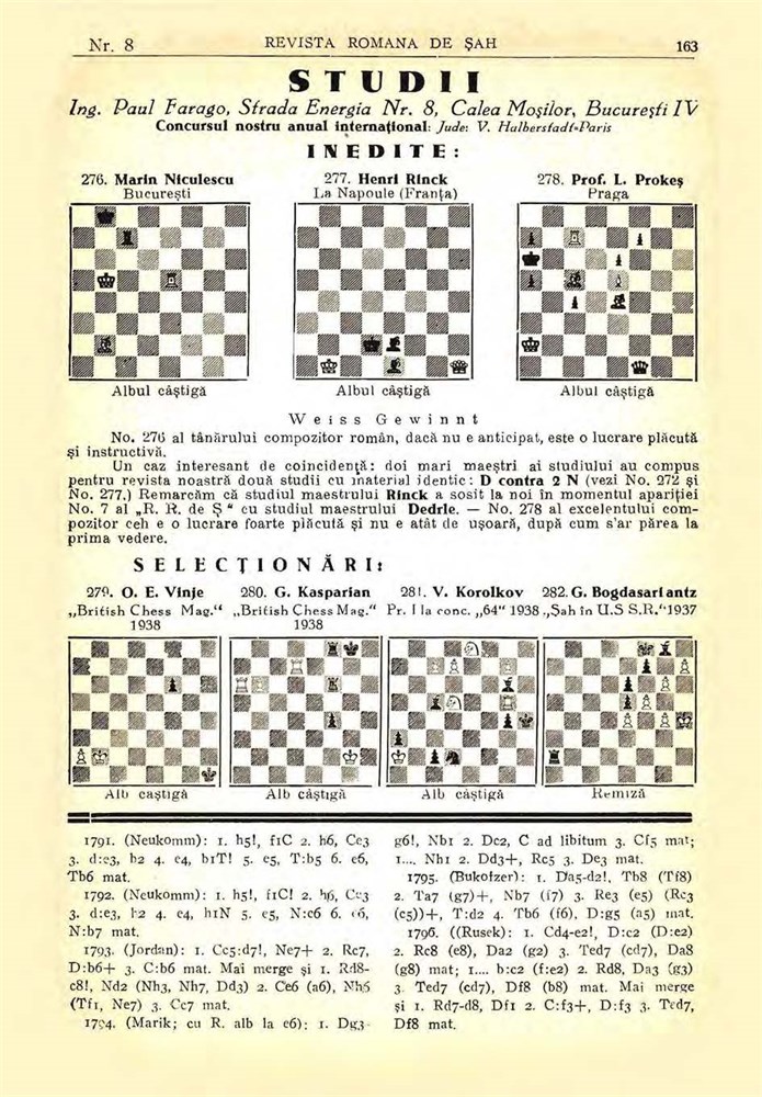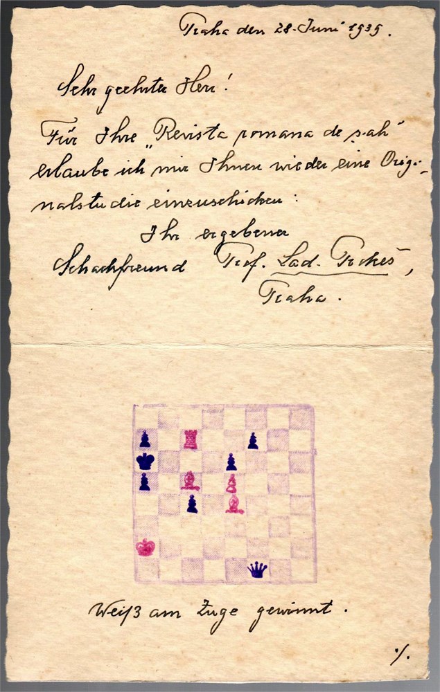 Letter to P. Farago, hand-written, in German, 2 pages, one sheet of thin cardboard, size 11x17 cm, with 1 diagram original stamped. The study was published in "Revista Romana de Sah", #8/1939, page 163.