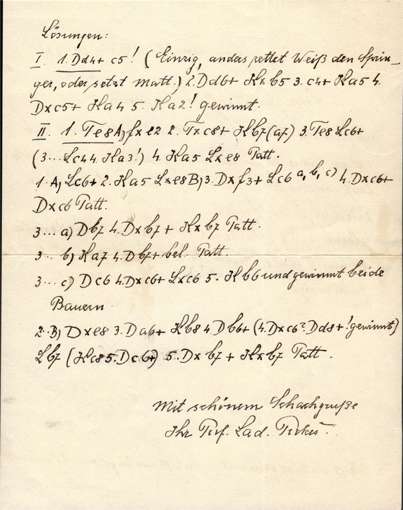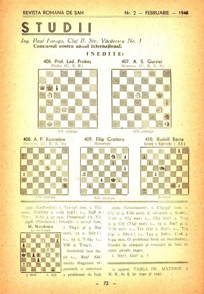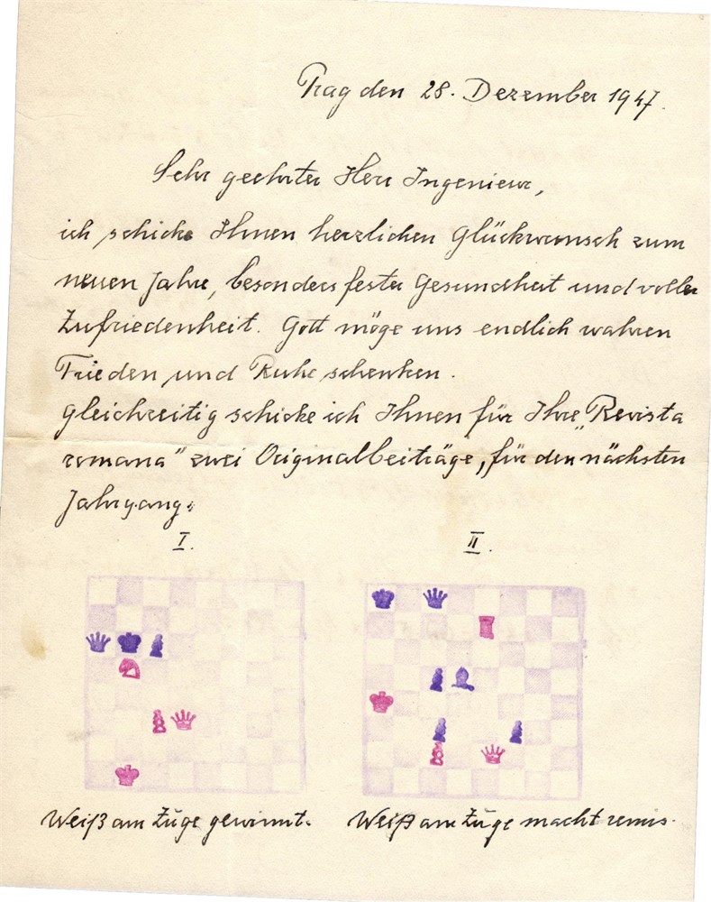 Letter to P. Farago, hand-written, in German, 2 pages size 15x19 cm, with 2 diagrams original stamped. The "I" study was published in "Revista Romana de Sah" #2/1948, page 72.