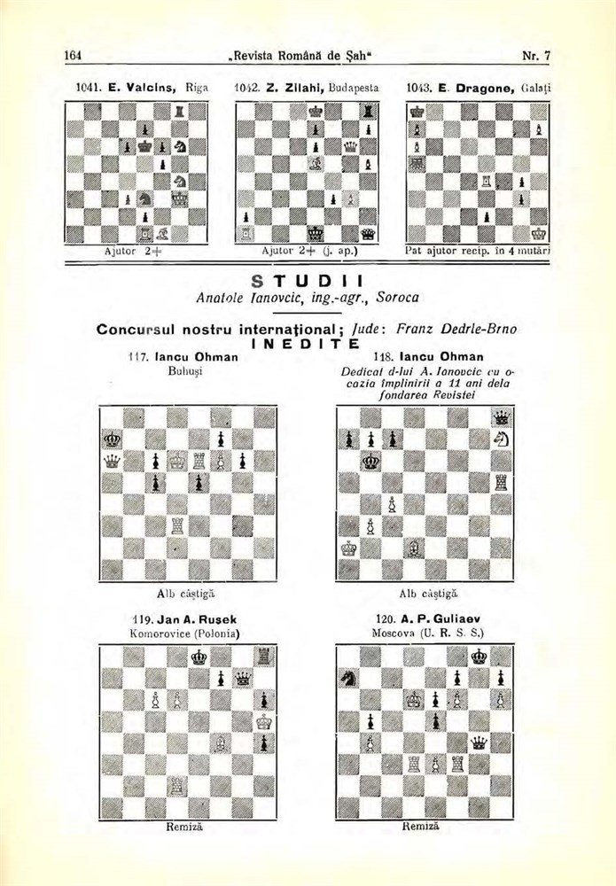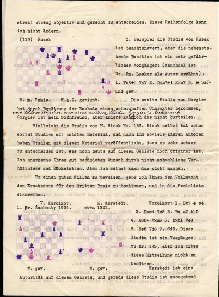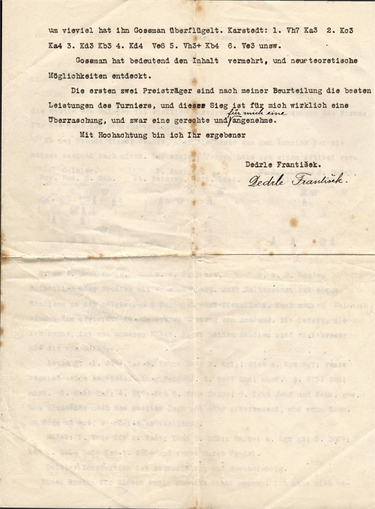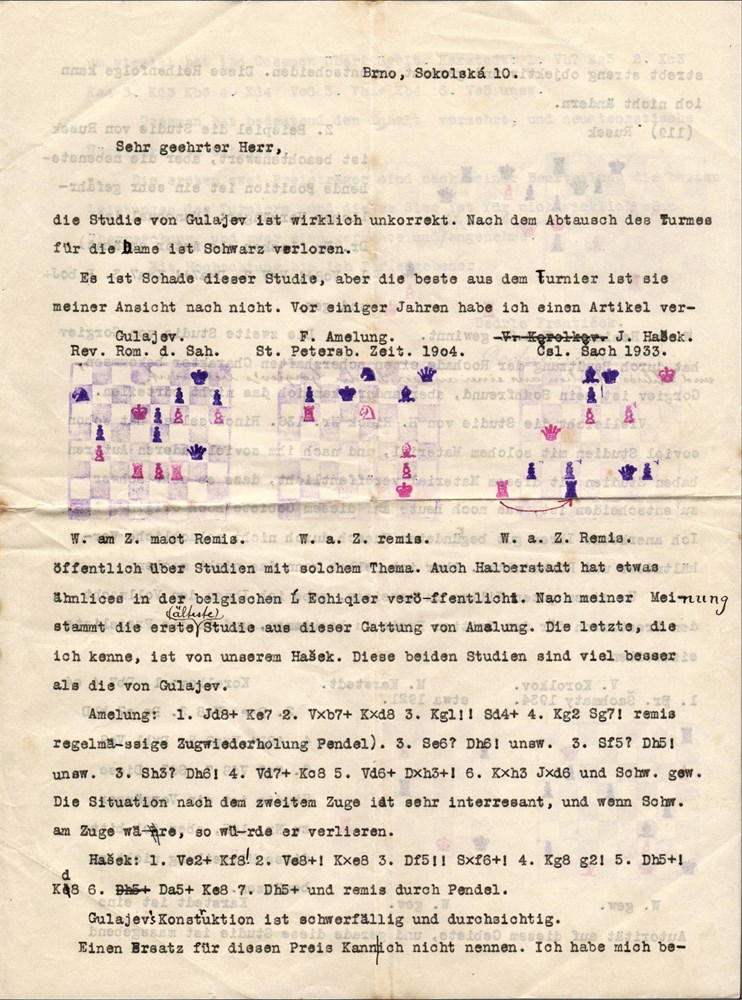 Letter to P. Farago, 3 pages size A4, undated, but most probably 1936, according to the reference to a study by Guljaev which was published in "Revista Romana de Sah" #7/1936, page 164. Type-written, in German, 7 original stamped diagrams, some hand-written corrections, original signature of DEDRLE.