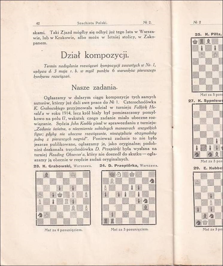 Szachista Polski. Volume 1. No. 1-2 published in 2 issues. A few photos. Many diagrams. Algebraic notation. Covers are paper covers, with ads on back cover and inner covers (in no. 2). 48 pages. 22,5 cm, stapled. No Index or titlepage published. Unknow publisher, Warsaw. L/N 6283. Felice 2585.
