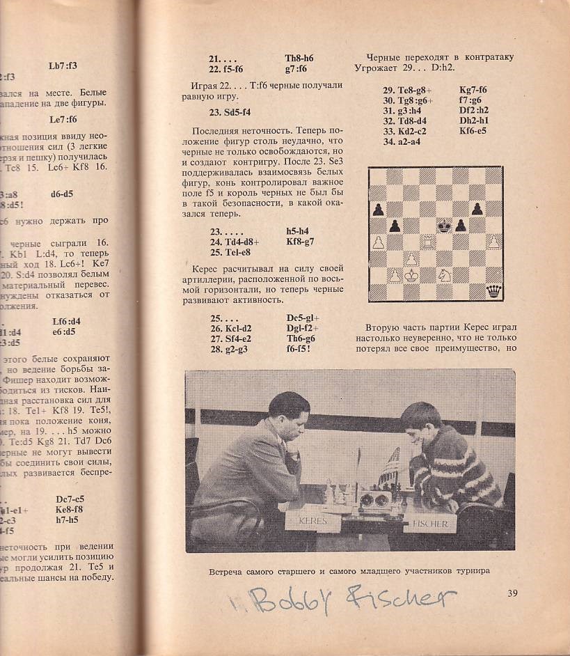 Bled - Zagreb - Belgrade 1959. Turnir pretendentov na match s chempionom mira. Candidate Tournament for the match against the World Champion. With a thorough presentation of the players, the tournament and the playing venue. 18 un-numbered pages with presentation and full page portraits of the players. Several photos in medium quality. All 112 games with annotations in Russian. Several diagrams. Algebraic notation. Round-by-round reports. Theoretical survey. Cross table. Progress table. Table of content. Opening index. Game index. Tal won in front of Keres. 302 pages. 24 cm. Paperback with publishers illustrated cover. Belgrade, 1960.