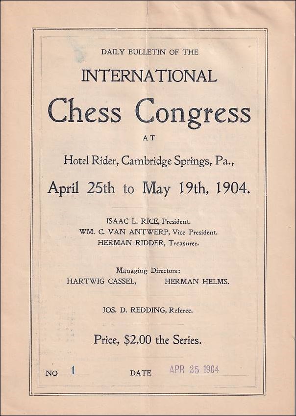 Cambridge Springs 1904. Daily Bulletin No. 1 - 15 and Supplement of the International Chess Congress at Hotel Rider, Cambridge Springs, Pa., April 25th to May 19th, 1904. All 120 games from the tournament without annotations and diagrams. Descriptive notation. Crosstable at the supplement. Marshall won in front of Janowski and Lasker. Each bulletin is a folded, uncut leaf with 8 pages. 22 cm. S.l. 1904. Betts 25 - 45.
