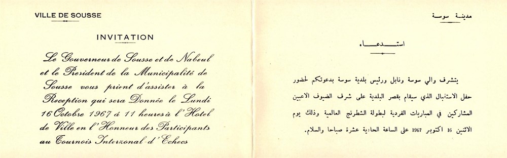 Soussa, 1967 IZT. Invitation … a la Reception … Lundi 16 Octobre 1967 a 11 heurs a l'Hotel de Ville …, a cardboard page of 32x10 cm folded in 2, in blank envelope.