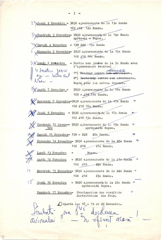 Soussa, 1967 IZT. Calendrier de l'Interzonal, 3 pages A4, type-written document, with en-tete "Federation Tunisienne des Echecs". Many annotations in ink made by Paul Diaconescu, one of the principal arbiters of the IZT.