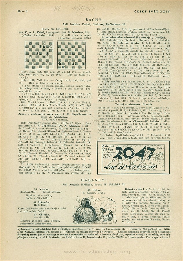 Praha, 1927/28. Free sheets disbound from the magazines. Enclosed: 2 title pages of the magazine (for the 1st and 2nd half) + 3 leaves containing chess photos published outside chess column. Editor master Ladislav Prokes. Size ca 30 x 22 cm. The weight 190 grams. Whyld: Chess Columns page 72; Mokry 284. In Czech.