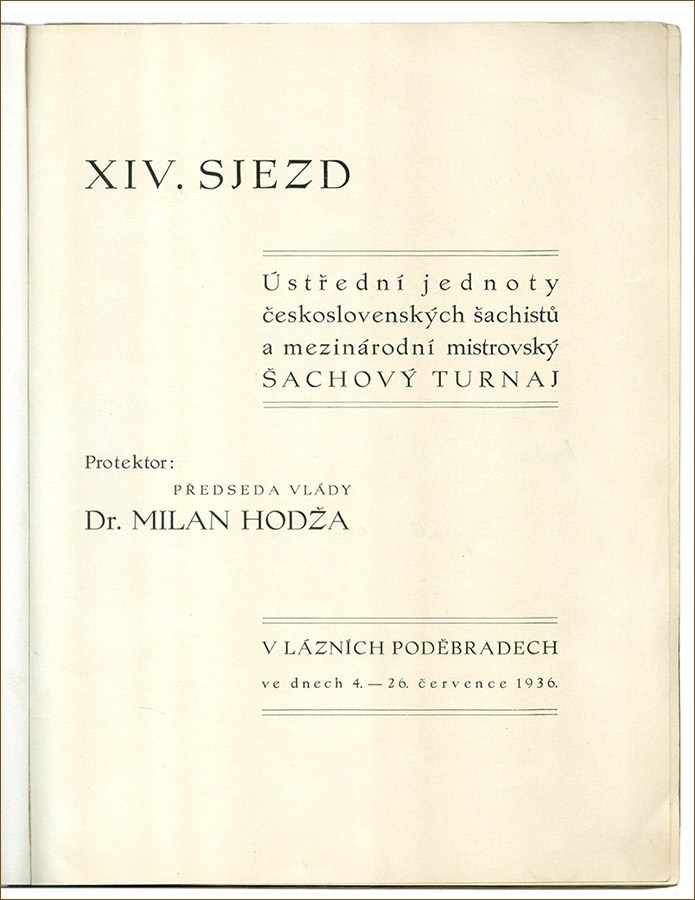 XIV. Sjezd Ustredni jednoty ceskoslovenskych sachistu a mezinárodni mistrovsky sachovy turnaj v Laznich Podebradech ve dnech 4.-26. cervence 1936 (program).