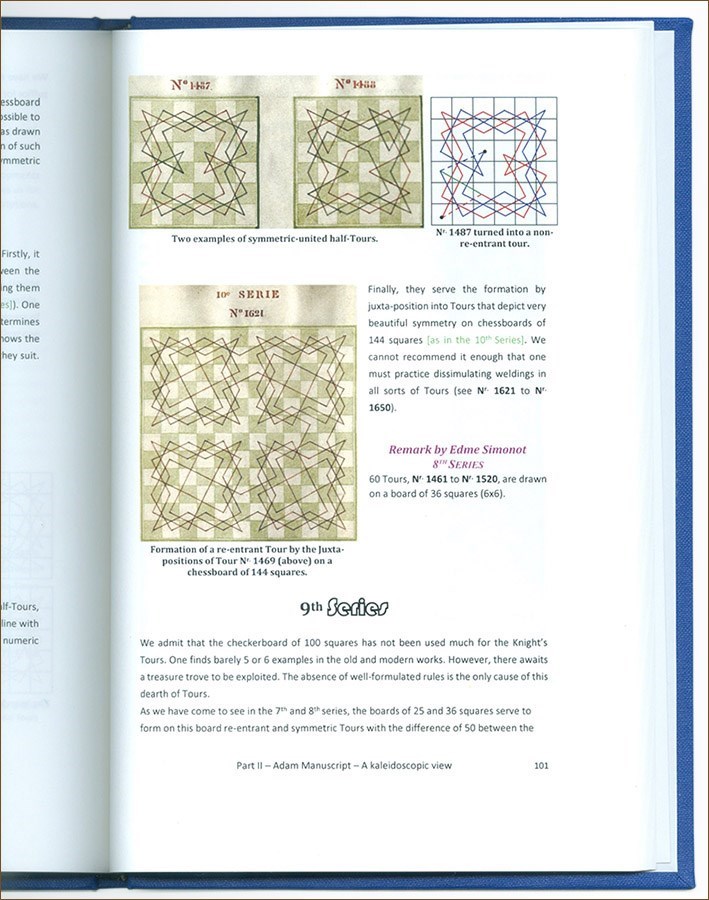 Sometime around 1840, hampered by increasing ‘infirmity’ and deafness, Adam jeune, who lived and worked in Rouen all his life, withdrew from his occupation as ‘professeur.’ He devoted the last 25-odd years of his life to chess theoretical issues, to the illustration of a series of around 40 chess classics in his library with more than 16,000 handprinted and drawn diagrams in total, and, finally to his book, about the Knight’s Tour, titled Le Kaleidoscope en 18 Series.