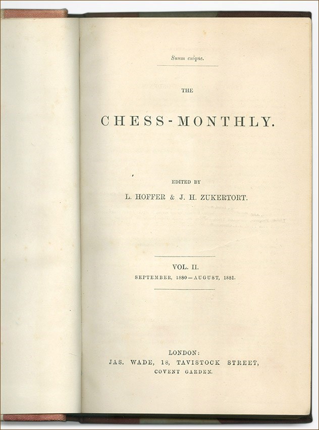 The Chess Monthly was published in London between 1879 and 1896 by Leopold Hoffer, together with J. H. Zukertort until 1888.