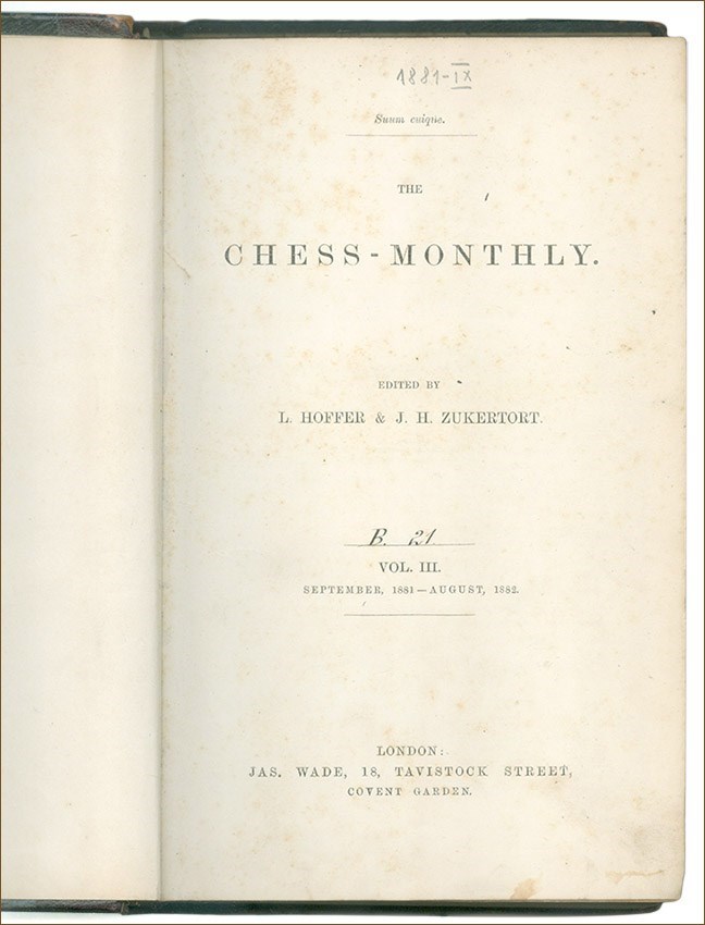 The Chess Monthly was published in London between 1879 and 1896 by Leopold Hoffer, together with J. H. Zukertort until 1888.