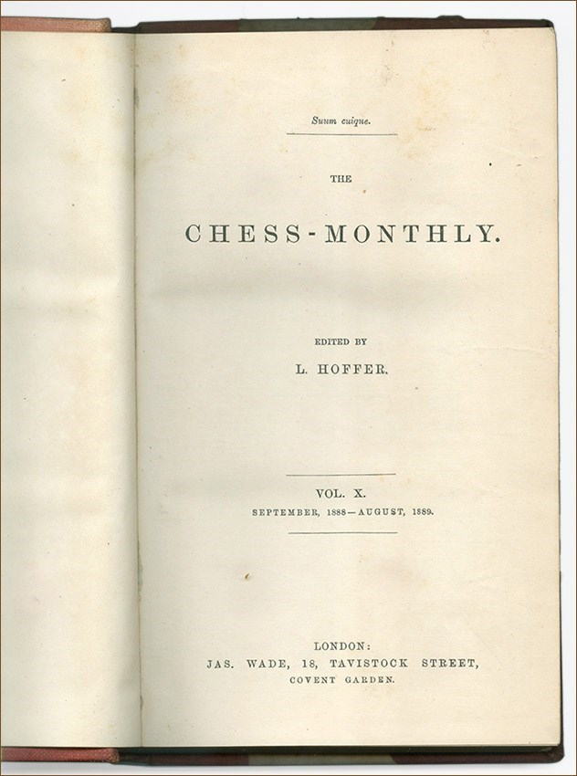 The Chess Monthly was published in London between 1879 and 1896 by Leopold Hoffer, together with J. H. Zukertort until 1888.