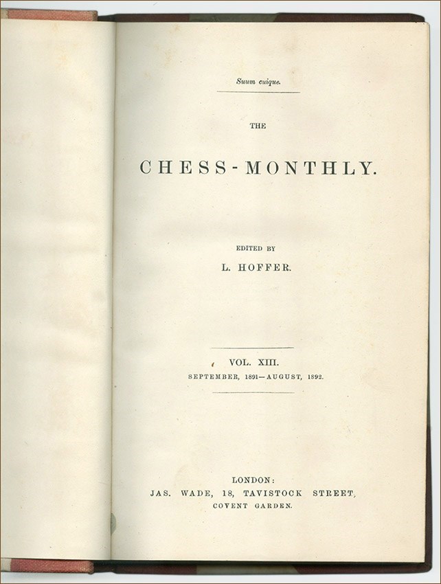 The Chess Monthly was published in London between 1879 and 1896 by Leopold Hoffer, together with J. H. Zukertort until 1888.