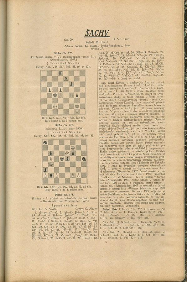 Praha, 1927. Private binding with no lettering. Complete set of 52 chess columns. All are offprints printed on rectos only except no. 24 (12/06/1927), which is a real column. Bound together with offprints 1-4/1928. 370 grams. Size ca 30 x 20 cm. In Czech. Whyld p.285, Mokry 337.