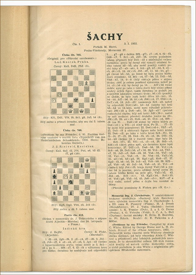 Praha, 1932. Private binding with no lettering. Complete set of 52 chess columns. All are offprints, printed on rectos only. 300 grams. Size ca 30 x 20 cm. In Czech. Whyld p.285, Mokry 337.