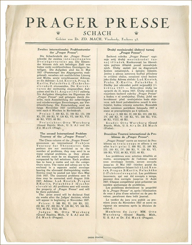 Prager Presse 1927: Announcement of the 2nd Int. Problem Tourney View Watchlist >