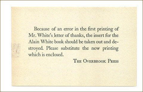 The publisher's printed card contains information that they are sending a corrected "A Note of Thanks" because there was an error in the first version. The error is that the first version of "A Note of Thanks" erroneously states (lines 1-2) "Mr. Frank Altschul in New York", while the second version correctly states "Mr. Frank Altschul of Stamford". Otherwise, the two "Notes of Thanks" are identical, containing one problem by A. C. White and one page of text.