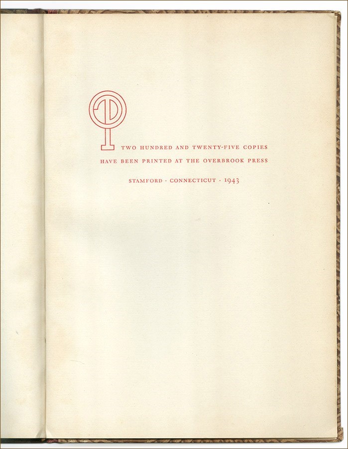 Eight titles were published by Overbrook Press between 1941 and 1945, all in limited editions of 150-400 copies. This is the sixth book of the series.