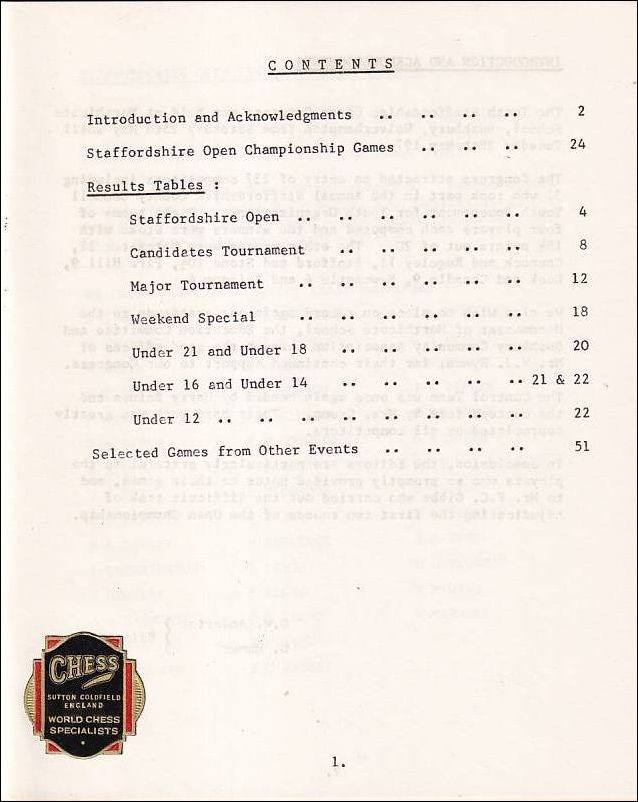 Wolverhampton 1974. Staffordshire Chess Congress (10th). All 35 selected games from the tournament of which a few have detailed annotations in English. No diagrams. Descriptive notation. Result tables for all classes. P. C. Griffith won. Typescript. Pamphlet, stapled. 20,5 cm. Wolverhampton 1974. Lusis 1714.