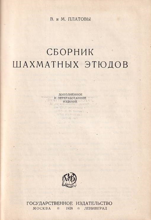 Platov, W. and M. Sbornik shakhmatnykh etyudov. Dopolnennoje i pererabotannoje isdanije. Moscow and Leningrad, Gosudarstvennoje Izdatelstvo, 1928. With 200 diagrams. 185 pp., 3 leaves with advertisements. Original bound. With dedication by author to Vladimir Neistadt, Moscow, 5.12.1928 on front cover. Good copy.