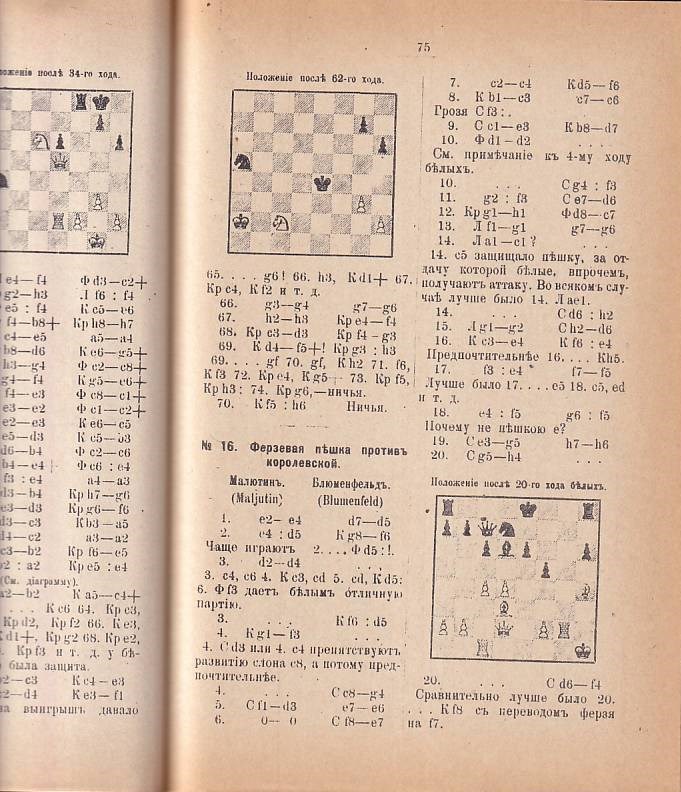 St. Petersburg 1906. IV Vserossiyskiy shakhmatnyy turnir S. - Peterburg, Dekabr' 1905 - Yanvar' 1906. Das vierte allrussische Schachturnier in St. - Petersburg, Januar 1906. One plate with a group photo is missing. 3 illustrations in text. All 115 games from the tournament with annotations by Alapin, Lewin and E. Snosko-Borowski in Russian. Many diagrams. Russian notation. Cross table. Games index. Opening index. Salwe won in front of Blumenfeld and Rubinstein. Chigorin withdrew from the tournament after round 4. 2 leaves 218 pages. 23,5 cm. St. Petersburger Schachverein, 1907. L/N 5276. Sakharov 75.