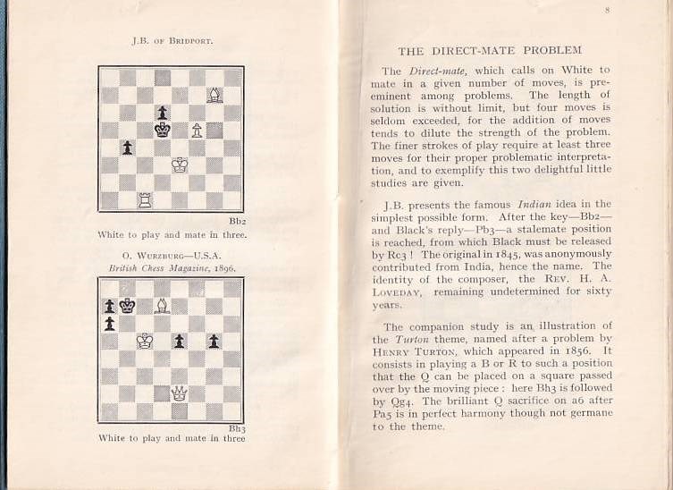 Feast, Frederic Bonner. Chess Cameos. A treatise on the two-move problem. Leeds, Whitehead & Miller, 1936. With many diagrams. 90 numbered leaves. Original cloth. L/N 2782. Betts 34 - 9.