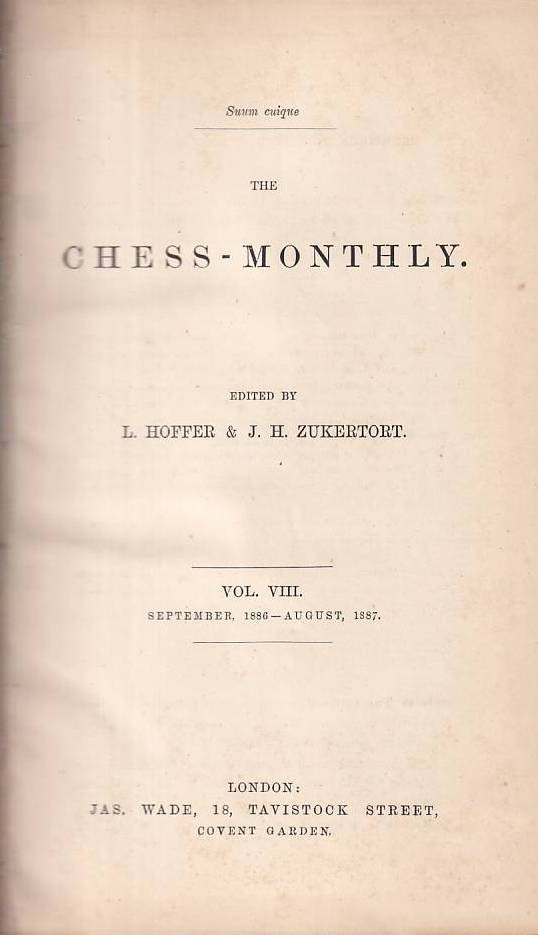 The Chess - Monthly 1886/87 vol 8. Edited by L. Hoffer & J. H. Zukertort. Volume VIII, September 1886 - August 1887. London, Wade, 1886 - 1887. With many diagrams. IV, 380 pages. L/N 6138. Betts 7 - 25. With titlepage and index. Rare and important magazine with a monthly overview of chess events from around the world, chess articles, games, problems, endgames, and book reviews.