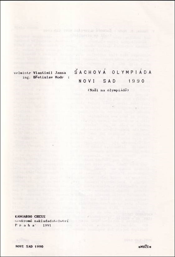 Šachová Olympiáda Novi Sad 1990. 98 selected games without annotations by Czechoslovakian players at the olympiad at the open section and at the womens olympiad. Some diagrams. Czech algebraic notation. Some photos in medium quality. Round-by-round reports. Statistics on individual players. USSR won in front of USA and England. 80 pages. Pamphlet, stapled. Kangaroo Chess, Prague 1991.