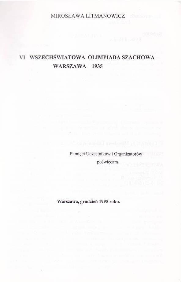 VI Wszechświatowa Olimpiada Szachowa, Warszawa 1935 by Mirosława Litmanowicz — a comprehensive Polish-language chess book on the 6th Chess Olympiad held in Warsaw, 1935