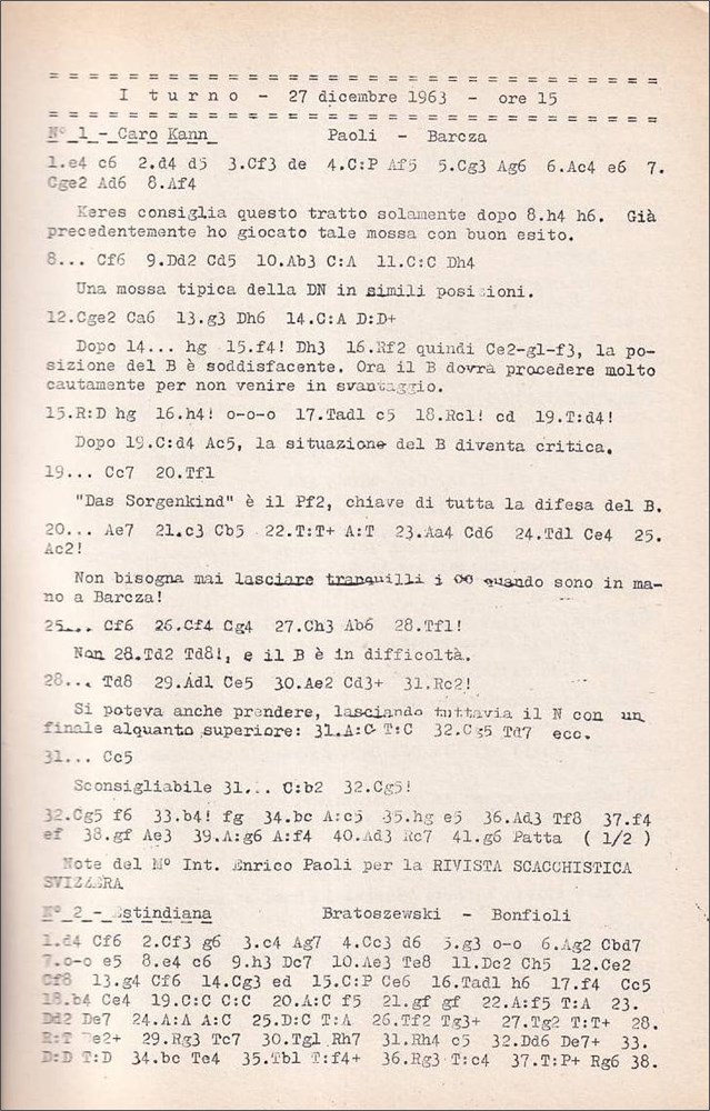 Reggio Emilia 1963-64. VI Torneo Scacchistico Internazionale Magistrale di Capodanno. Reggio Emilia 27-XII-1963 - 6-I-1964. All 66 games from the tournament without annotations. No diagrams. Cross table. Game index. Opening index. Teschner won in front of Gereben. circa 20 un-numbered leaves printed rectoand verso. Partly in German and Italian. 30 cm. Typescript. Stapled. In a cardboard wallet. Reggio Emilia 1964. Limeamenti, 623.