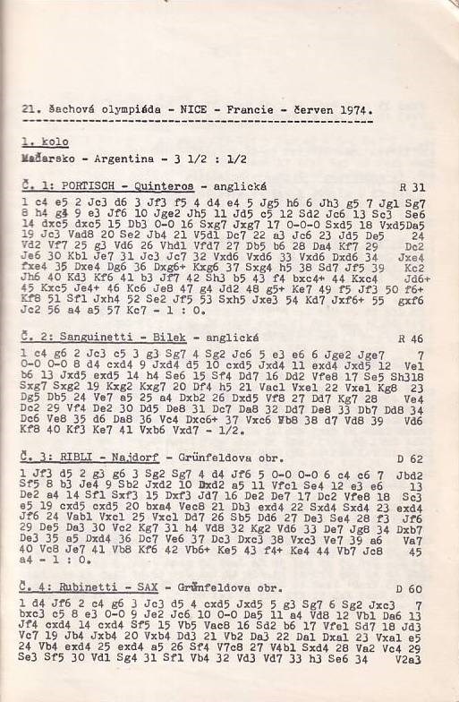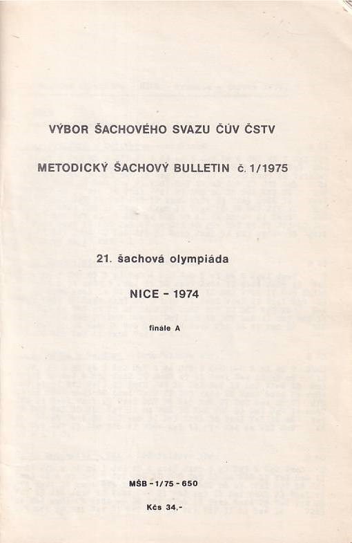 Nice 1974. XXIe Jeux Olympiques Échiquéens 1974. 21. sachová olympiáda Nice - 1974 finale A. [Bulletin]. 448 games from the Olympiad without annotations. No diagrams. Czech algebraic notation. Final standings. Opening index. Soviet Union won in front of Yugoslavia. 101 pages. 20 cm. Paperback, glued. "Metodický Sachový Bulletin", c. 1 / 1975.