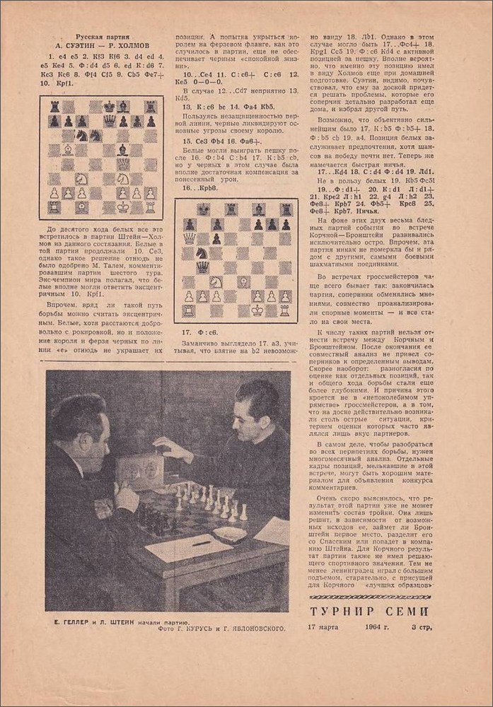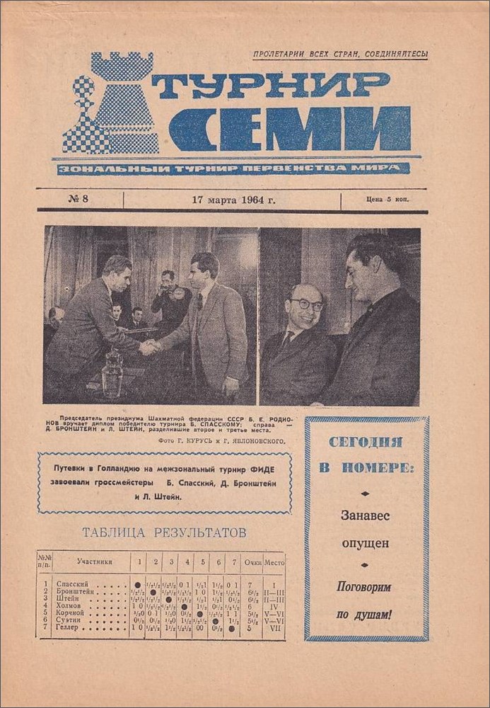 Moscow 1964. Turnir semi. World championship zonal tournament, USSR Central Chess Club, 22. Feb. - 17. Mar. 1964. All 42 games from the FIDE zonal tournament and games of the playoff match M. Ranniku - T. Zatulovskaya (23. women's USSR championship) and other materials. All games have detailed annotations in Russian. Many diagrams and photos in newspaper quality. Spasski won in front of Stein and Bronstein. Bulletin No. 1-8. 64 un-numbered pages. Special edition. Moscow 1964. Sakharov 1091.