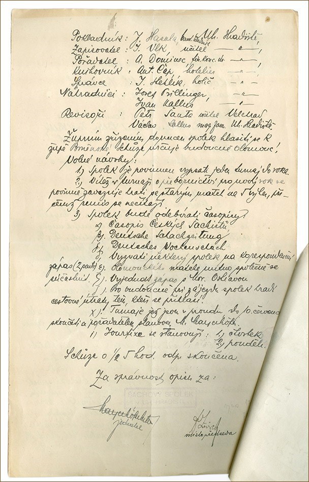 The members of the new club include strong local chess players such as Dr. Jiri Kauder, Milos Mayerhofer, and Cenek Dominec (president).