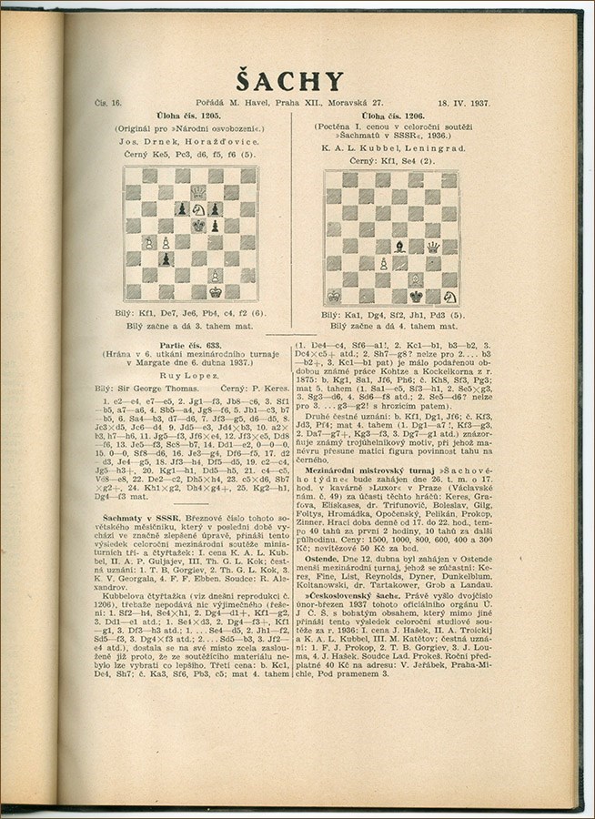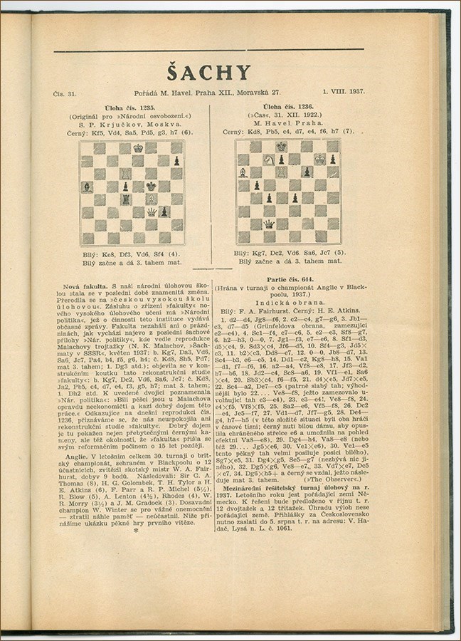Praha, 1937. Private binding with no lettering. Complete set of 52 chess columns. All are offprints, printed on rectos only. 300 grams. Size ca 30 x 20 cm. In Czech. Whyld p.285, Mokry 337.