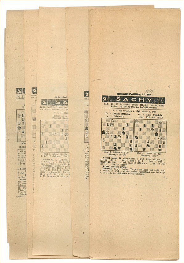 Praha, 03/01-25/04 1945. Editor Emil Palkoska. Size ca 28 x 10 cm (the last column 11.5 x 7 cm). The weight 30 grams. Whyld: Chess Columns page 285; Mokry 338. In Czech.